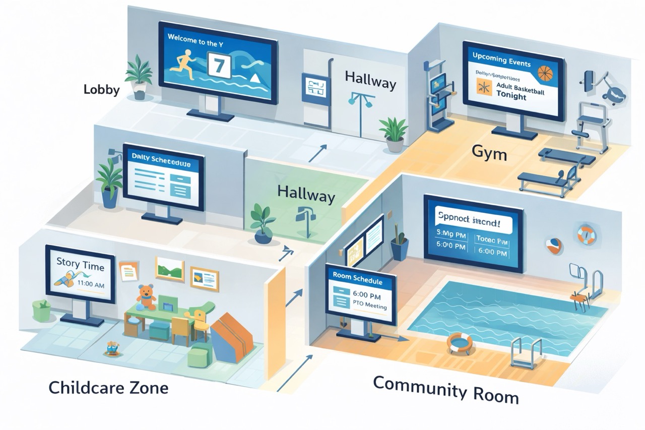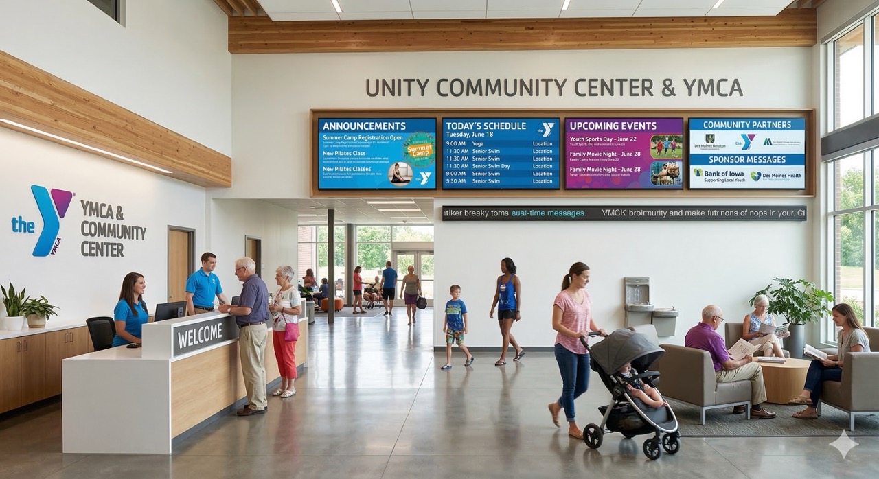Share schedules, youth programs, events, announcements, and sponsor messages across your facility.
